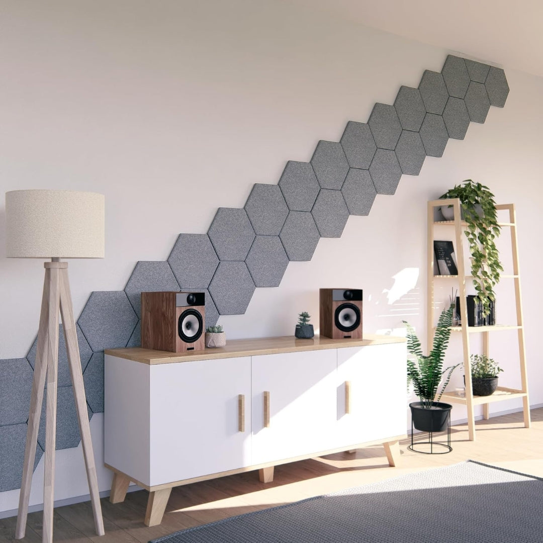 - 12 panneaux acoustiques hexagonaux autocollants en feutre (gris ou blanc selon choix)