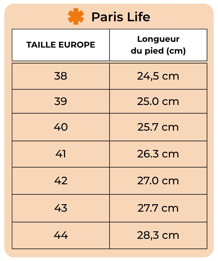 - Pieds de largeur moyenne : choisir une demi-taille en dessous pour un port pieds nus ajusté